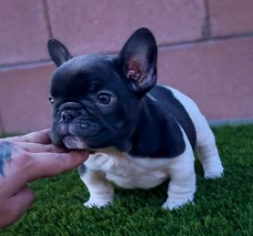 3-week Frenchie Bulldog puppy “Moo” (whelp name Yin Yang) with black-and-white pied markings, side profile, held in a gloved hand.